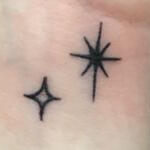 three piercings in each earlobe; orbital and helix piercings in each ear; tongue piercing; navel piercing. solid black one-inch bands tattooed around each wrist and ankle. black-and-white panther skull among watercolor hibiscus and orchid flowers tattooed on the outside of both thighs. real-world only: tiny, simple pair of stars centered on the collarbone; from "peter pan."