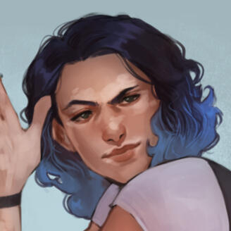 on the taller side and built lean, pan bears an athletic edge plain in the hard cut of muscle in his arms and thighs. his hair is a mess of shoulder-length, unkempt curls, always dyed in varying shades of deep or denim blue. their eyes are a dull forest green, lit from behind by a snarky fire. light-complected to begin, vitiligo mottles their skin, making them an odd sight.